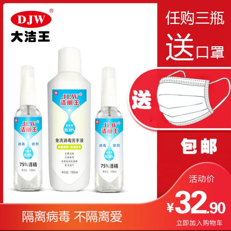 【送口罩】洁丽王免洗消毒洗手液150ml 酒精消毒喷剂100ml 任购3瓶 送口罩